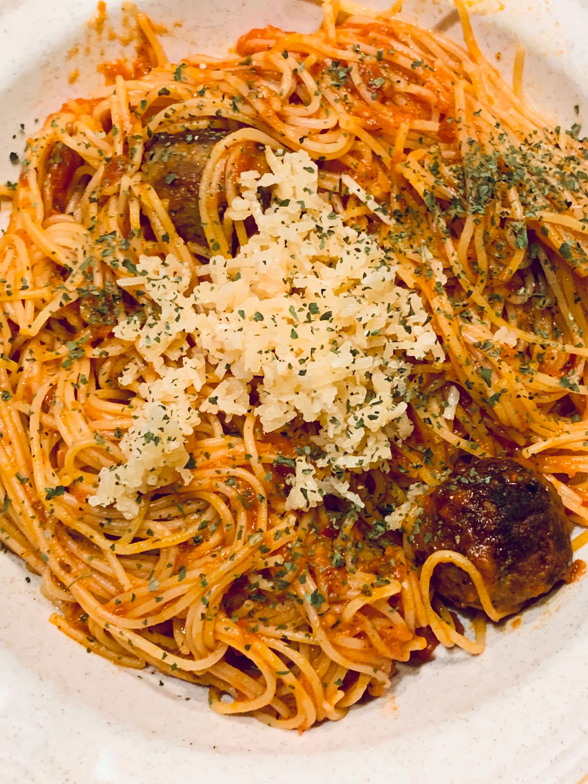Angel Hair pasta 🍝 with Arrabbiata sauce and turkey meatballs seasoned with the MasterChef Gary Premium Organic “Vu-Doo” Spicy 🌶 seasoning topped with fresh Parmesan & Romano cheese 🧀.