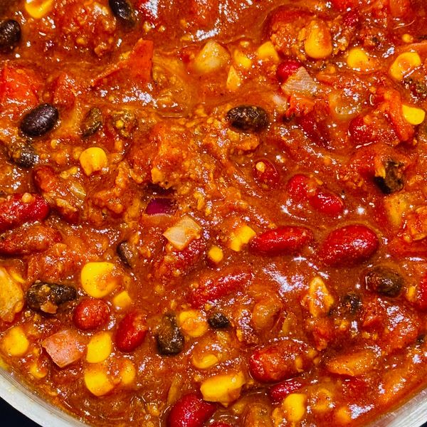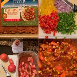 This Vegan chili with Plant-based "Chorizo" is easy to make and has the texture of a meat chili. I used diced red onion, black beans, kidney beans, corn, chopped or diced tomatoes, Bloody Mary Mix, and Master Chef Gary's "Vu-Doo" seasoning to taste. Cook approximately 20 minutes on medium heat and serve. Folks won't know the difference.
