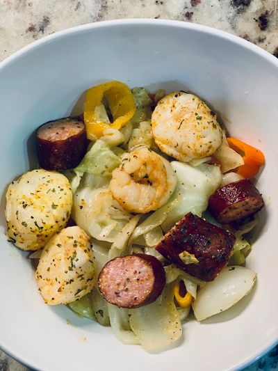 --Pan fry, bake or air fry the sausage and seafood (I air fry on a grill plate) at 375 degrees for approximately 15 minutes