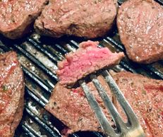 Petite cut sirloin steaks sprayed with avocado oil and seasoned with the MasterChef Gary Premium Organic Seasoning and melted butter in the air fryer for approximately 15 minutes. .