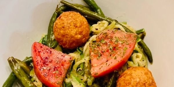Spiral Zucchini squash with scorched green beans cooked in Ghee butter and macadamia oil with plant-based meatballs and marinated tomatoes.