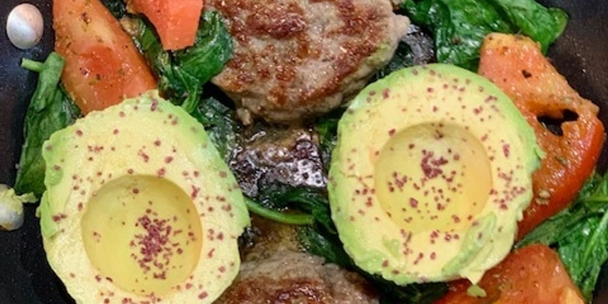 Premium pork sausage with sauteed spinach, marinated tomatoes and avocado slices with Merlot salt.