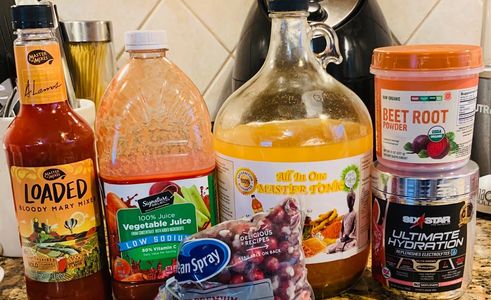 Place cranberries in blender and add 6 oz. of Master Tonic, 6 oz. of Bloody Mary Mix and 6-12 oz. of Low-Sodium Vegetable or Tomato Juice. Add 3 scoops of Organic Beet Root powder and 2 scoops of low-sugar or no sugar Hydration powder.