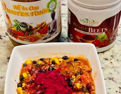 This is a plant-based chili seasoned with the MasterChef Gary "Vu-Doo" seasoning with dark red kidney beans, black beans, roasted corn, diced green peppers and tomatoes. For additional health benefits and a distinct sweet flavor, sprinkle a teaspoon of organic beet root powder and a splash of the All-In-One Master Tonic into your individual bowl and stir. Enjoy the best tasting and healthiest chili you've had in a long time.