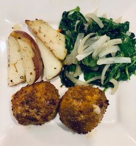 Hand rolled meatballs stuffed with cheese in the air fryer at 390 degrees for 15 minutes. Add fresh pan fried spinach and sliced onions with boiled red potatoes.